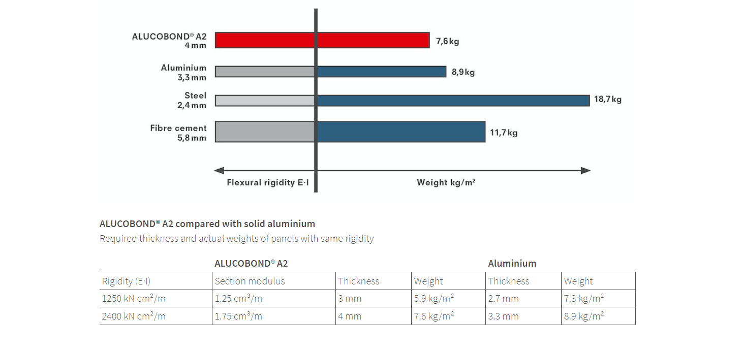 ALUCOBOND® A2 е нашият негорим алуминиев композитен панел, използван в архитектурата, който отговаря на съответните стандарти в световен мащаб. Благодарение на своята минерална сърцевина, ALUCOBOND® A2 отговаря на строгите изисквания на противопожарните норми и разширява възможностите за концепция и дизайн на сгради. ALUCOBOND® A2, подобно на всички продукти от фамилията ALUCOBOND®, позволява лесна обработка, устойчив е на удар, счупване и атмосферни влияния и преди всичко негорим.