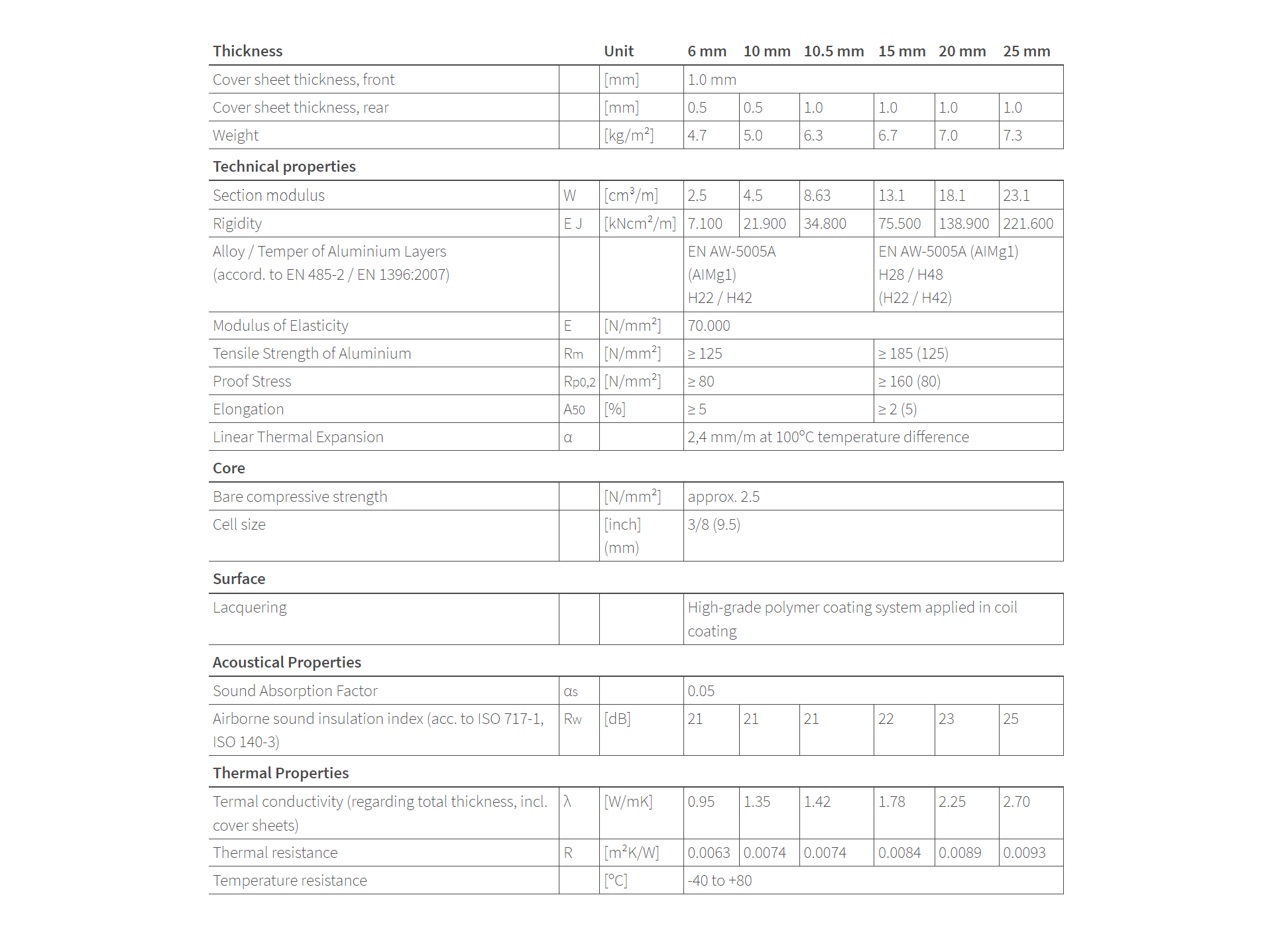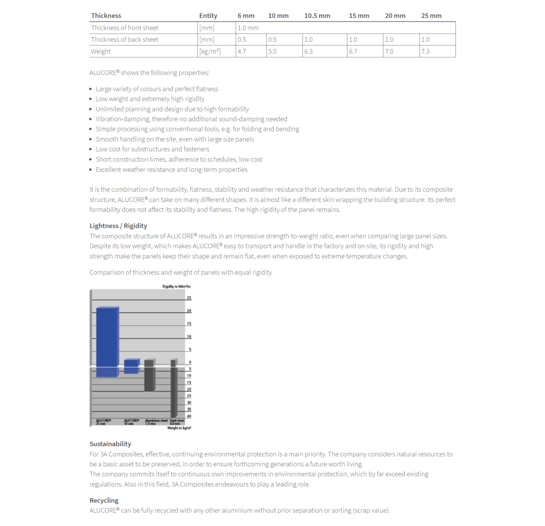 За разлика от конвенционалните композитни панели тип пчелна пита, системните компоненти на ALUCORE® са съединени в непрекъснат процес. Материалът показва здрави и еластични свойства и отлична якост – основата за високо качество на продукта. Проектанти, архитекти и дизайнери оценяват ALUCORE®, защото съчетава високи механични свойства, като якост на опън на покриващите листове и с изключителна податливост на обработка.